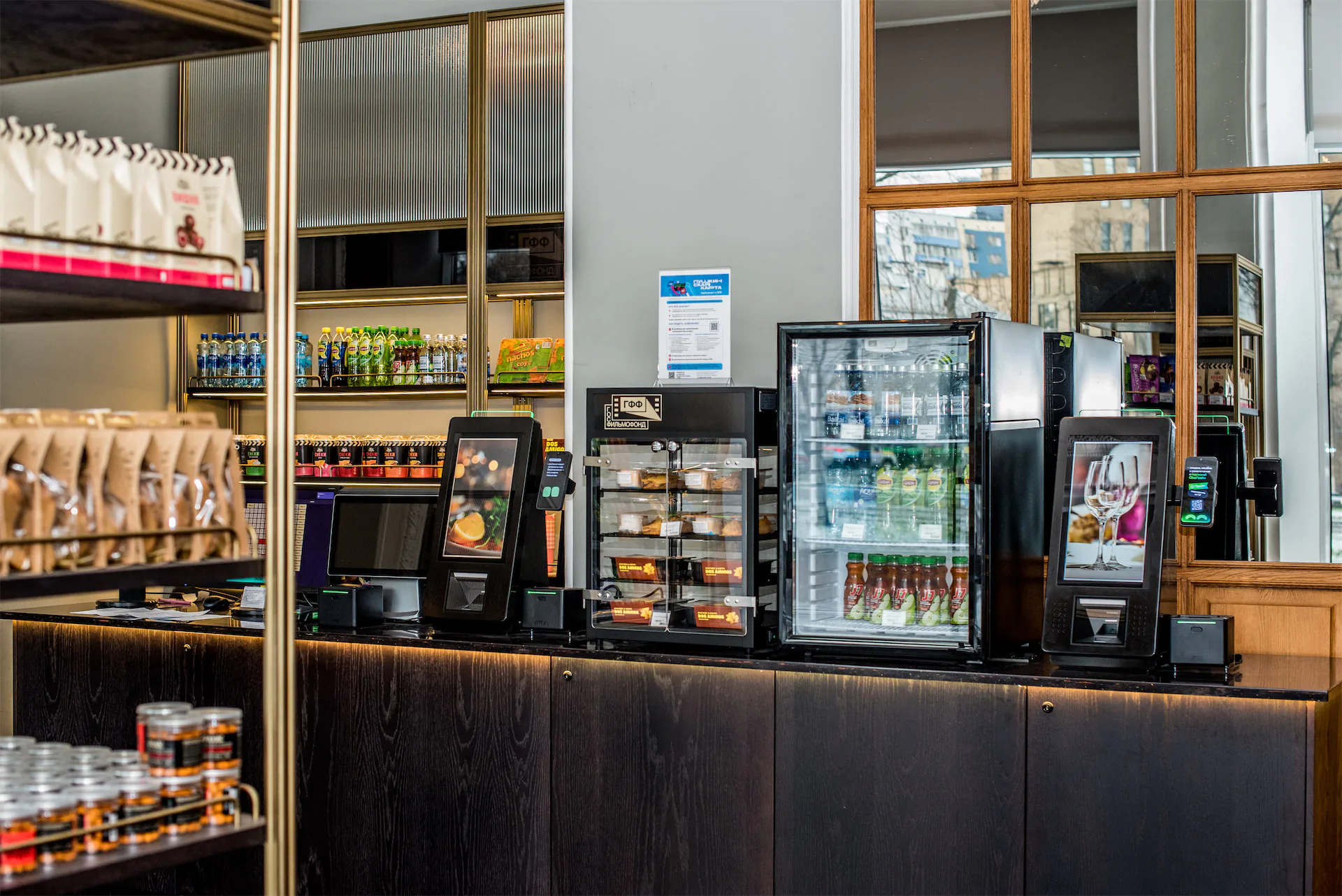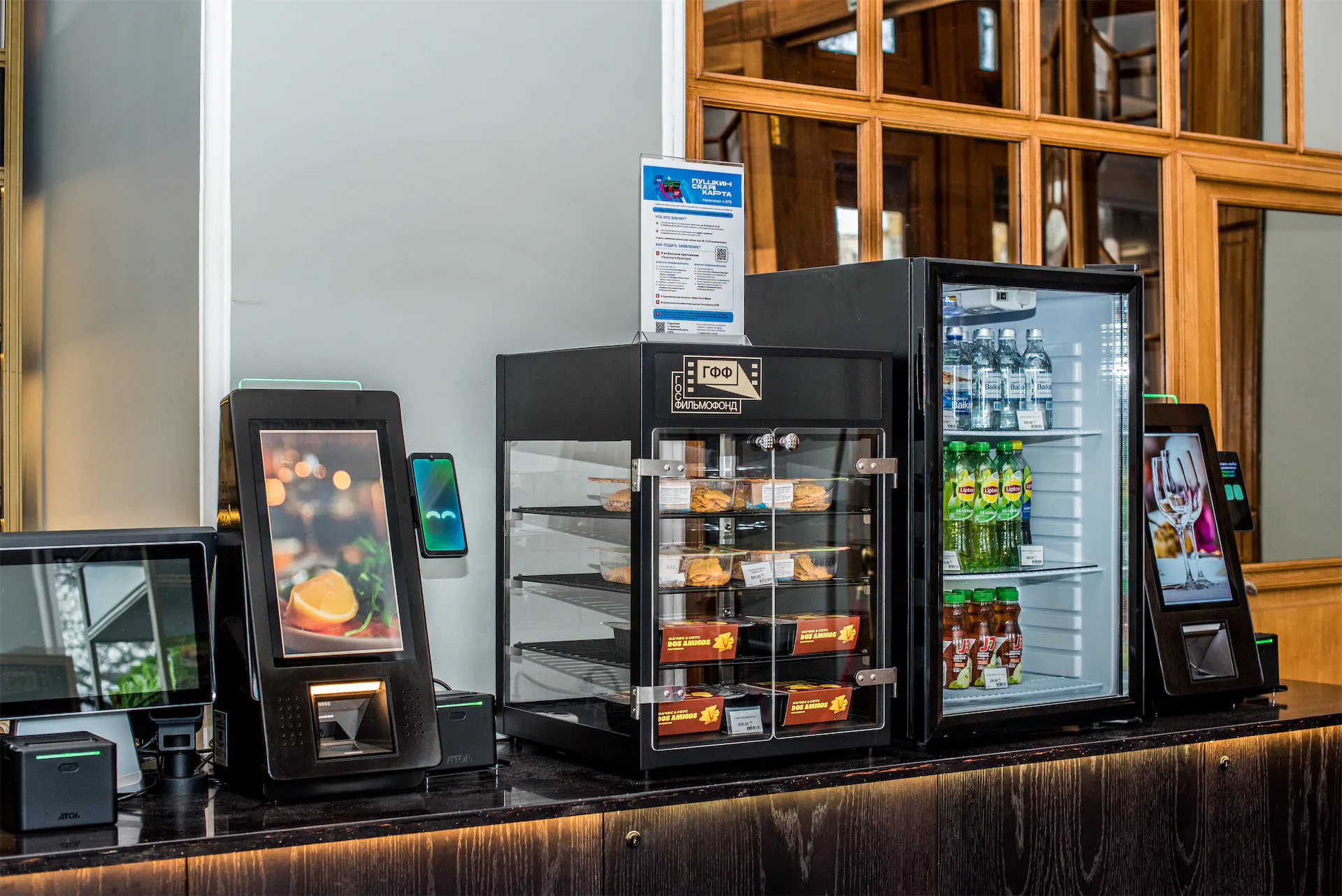 Дополнительно к билетным терминалам в кинотеатре установлены кассы самообслуживания TOUCHPLAT® SC-04, с помощью которых посетители могут приобрести без очереди напитки и закуски.