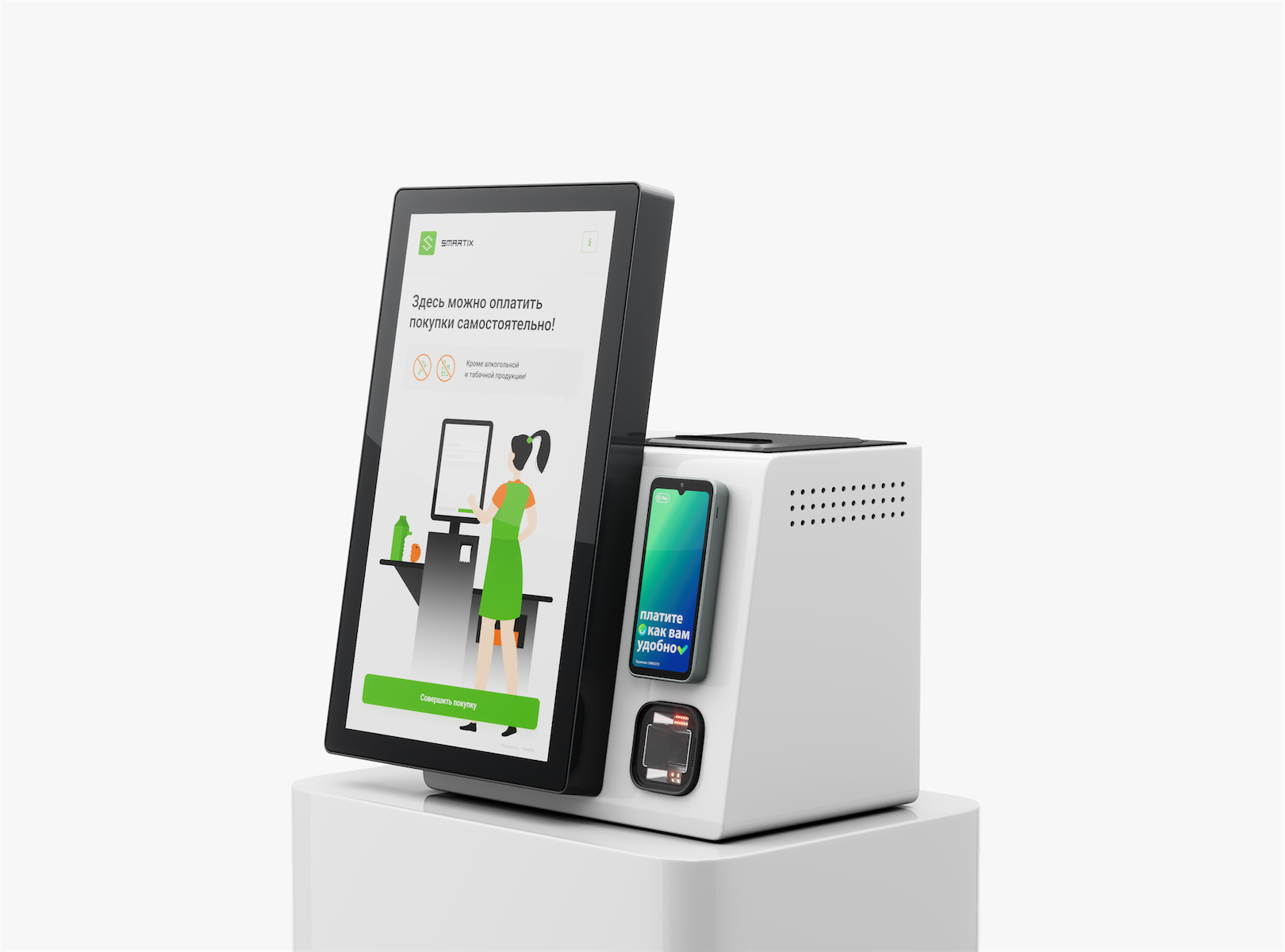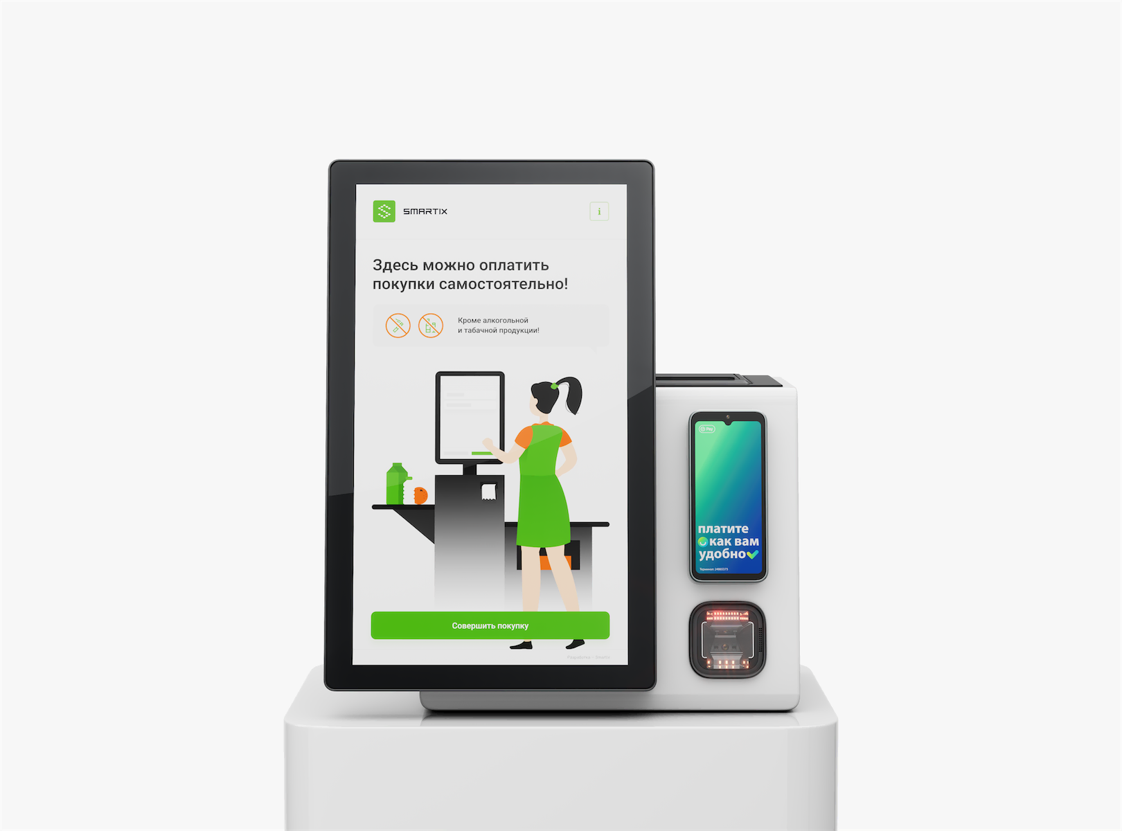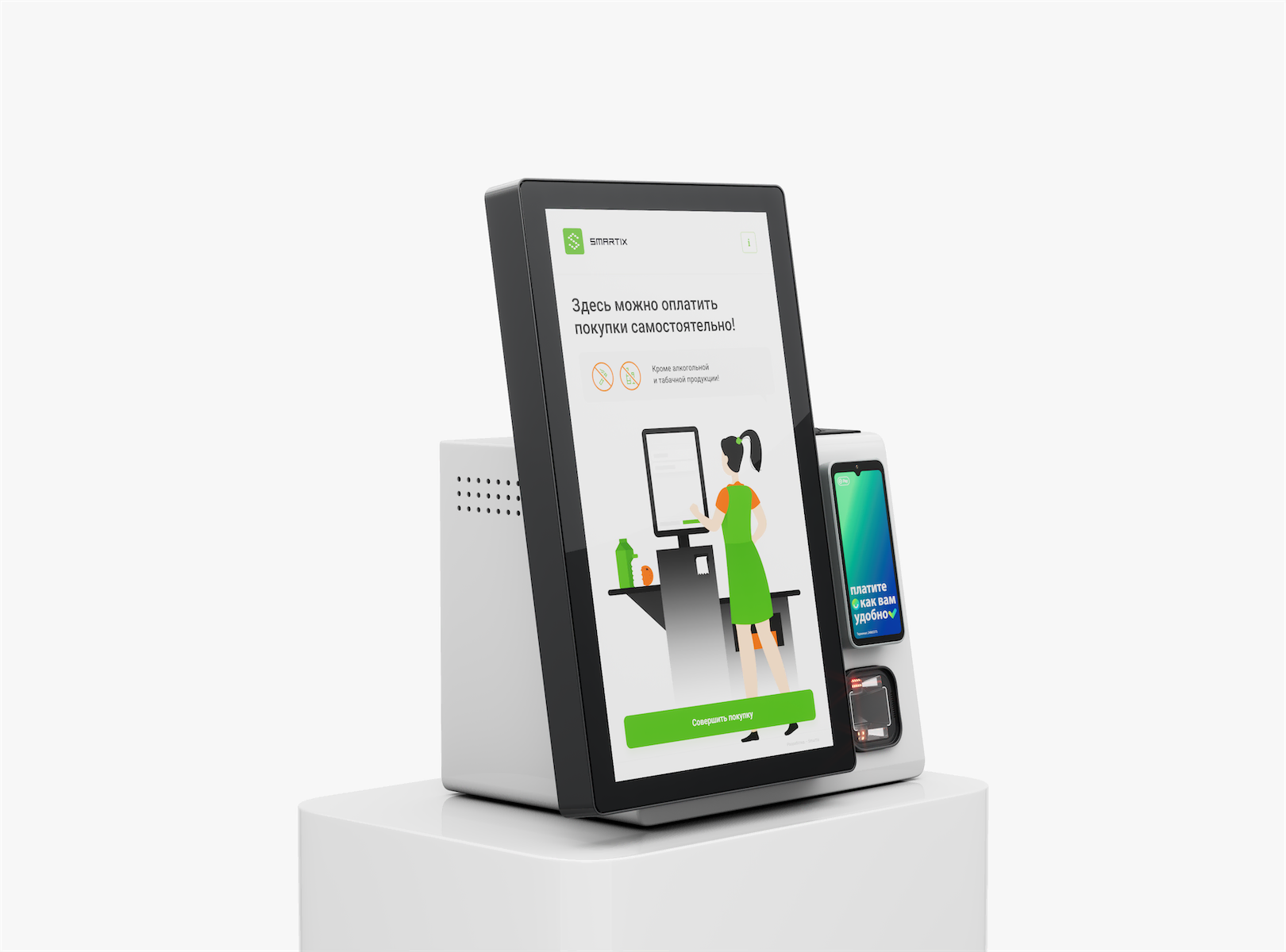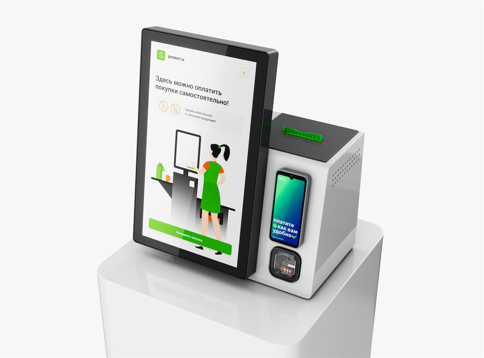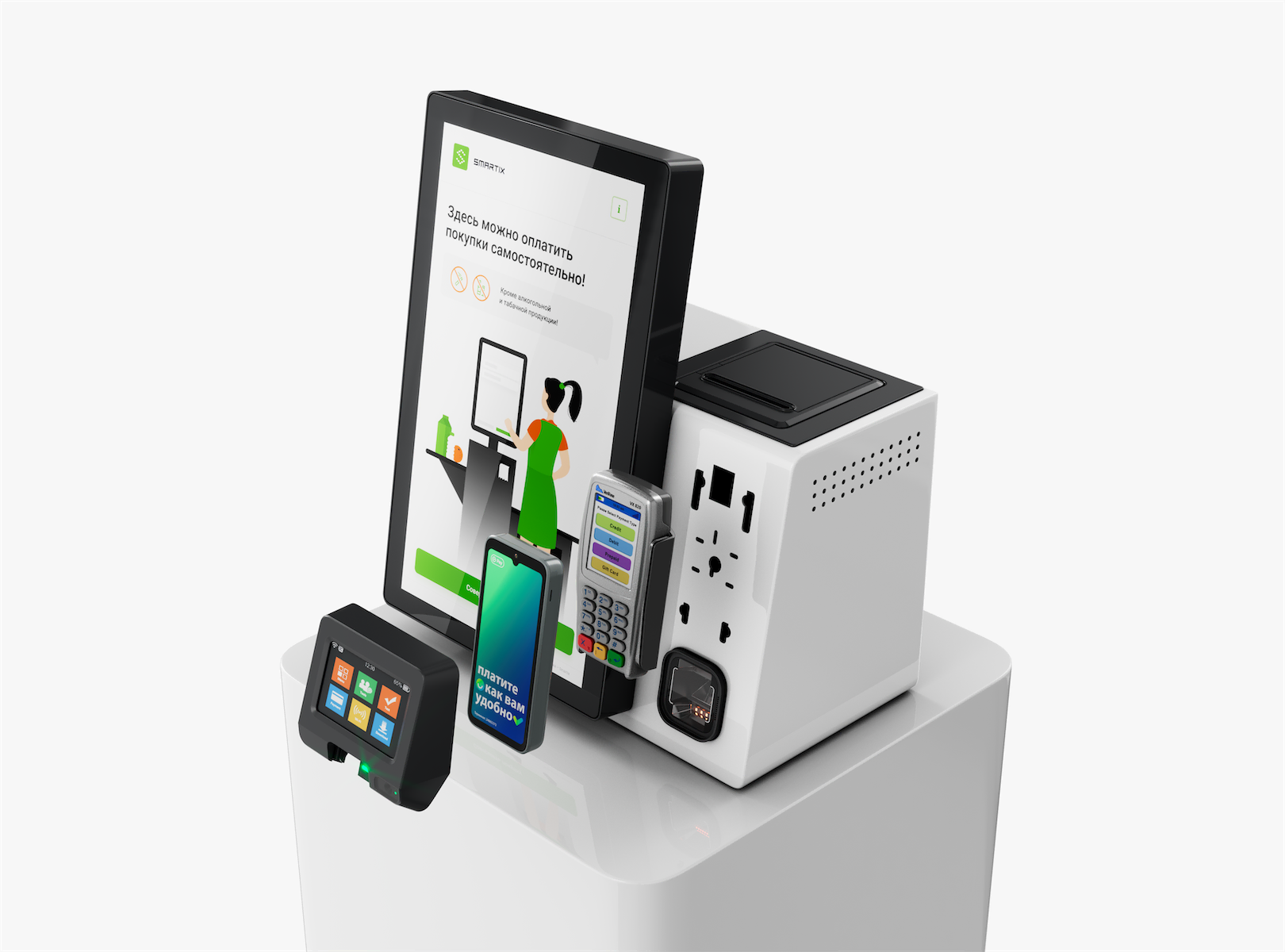 Список покупок выводится на большой дисплей 21,5″ , а за распознавание 1D/2D кодов отвечает многоплоскостной считыватель Datalogic Magellan 1500i. Для оплаты покупок на КСО устанавливаются различные модели терминалов оплаты, в том числе с поддержкой биометрии (Kozen P10F и аналогичные).