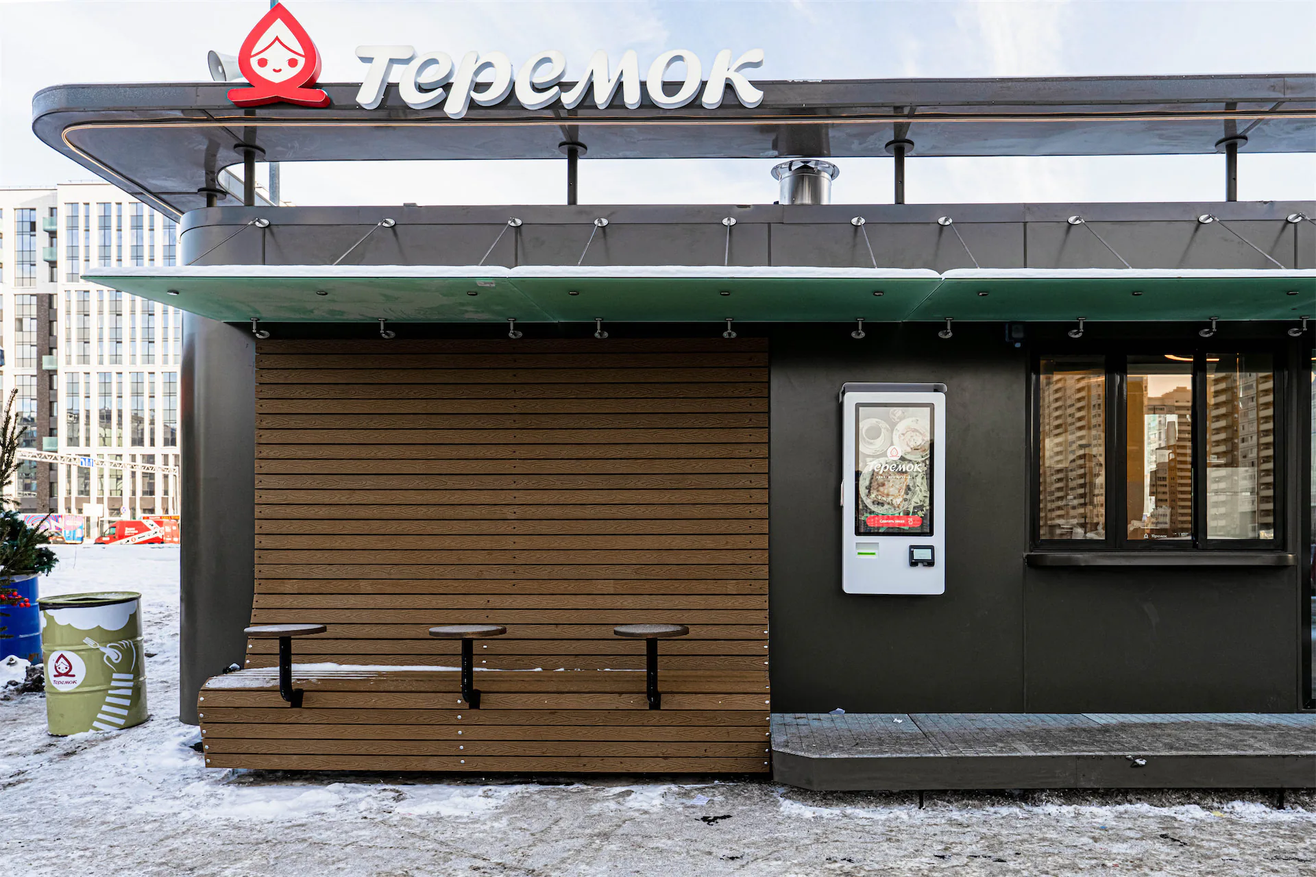Павильоны нового формата выгодно отличаются по размеру от уличных “Теремков”, расположенных преимущественно возле станций метро, а также оснащены всепогодными терминалами самообслуживания TOUCHPLAT® Q-60 Street, позволяющими сделать заказ, не заходя в помещение.